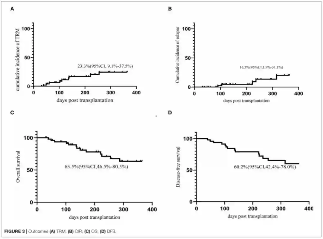 主要终点是1年TRM。次要终点为植入情况、急性移植物抗宿主病(aGVHD)、慢性移植物抗宿主病(cGVHD)、CMV再激活、EBV再激活、复发、总生存率(OS)和无白血病生存率(LFS)。