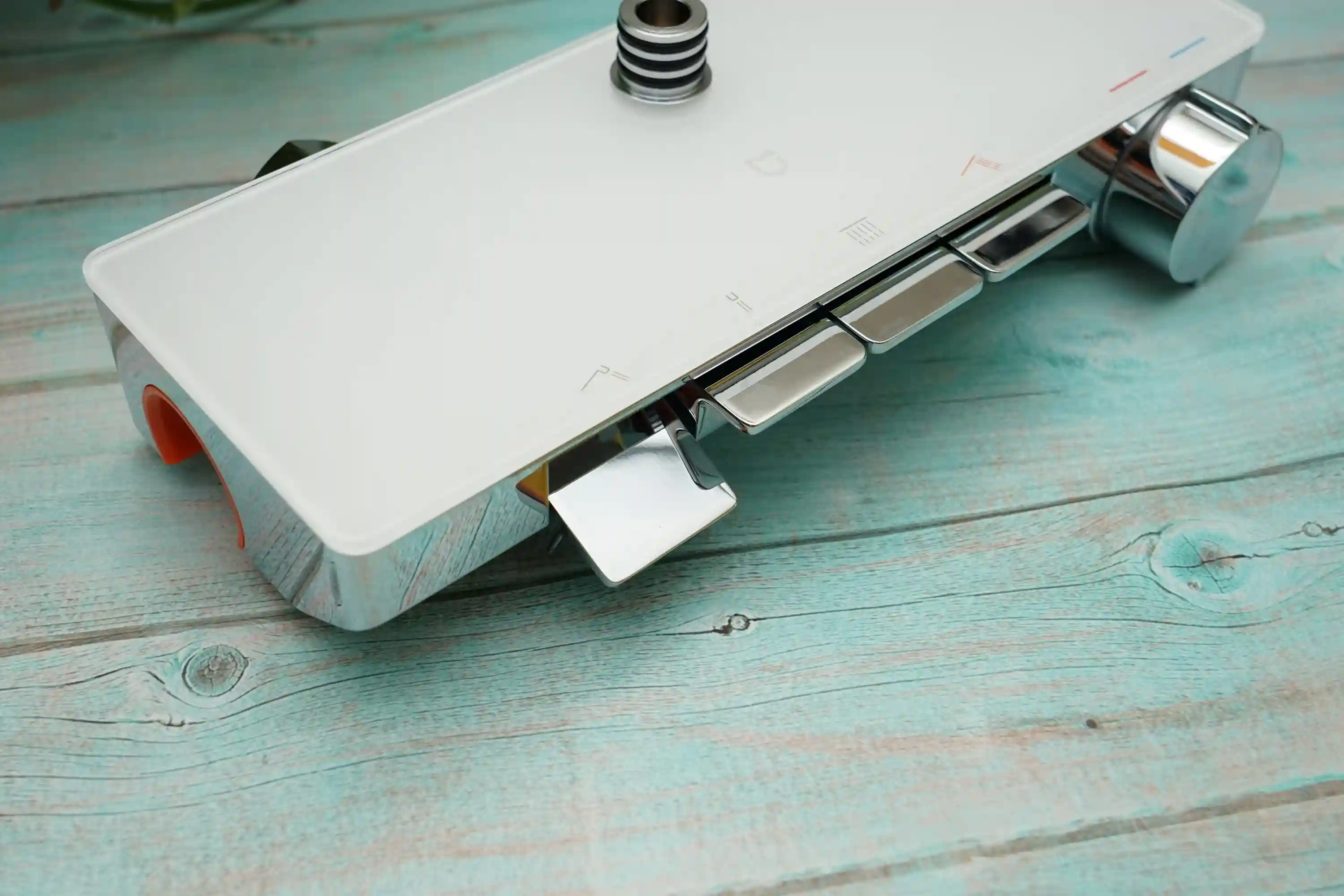 先来看看具体的配件。首先就是这个沉甸甸的淋浴主体控制台,一共4个钢琴按键以及温控旋钮。