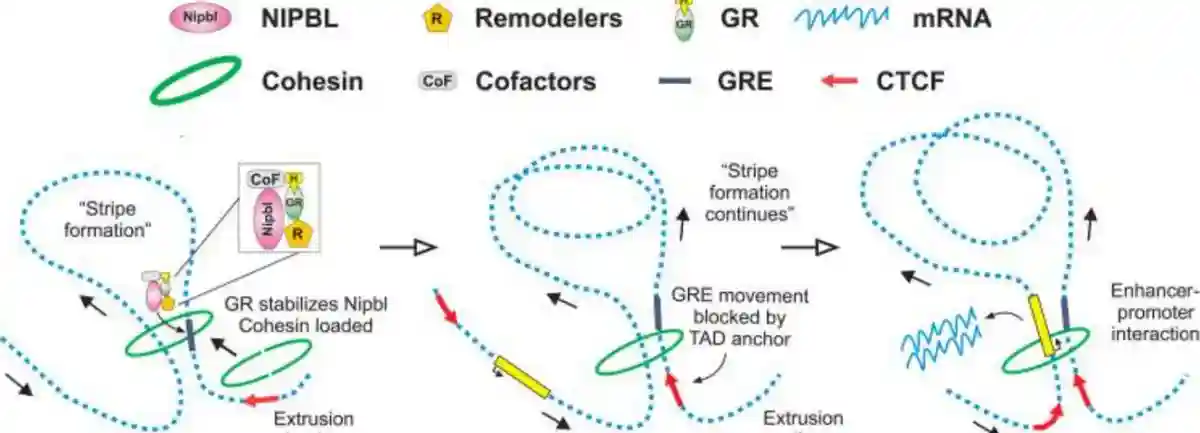 然而,这些糖皮质激素受体亚基的相当大一部分(约60%至80%)与染色质无直接关联,至今,关于转录机制与内聚素复合物之间相互作用的机制仍不清晰。