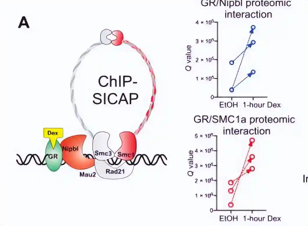 发现凝聚素加载器NIPBL和粘连素亚基SMC1a与染色质结合的GR发生相互作用。