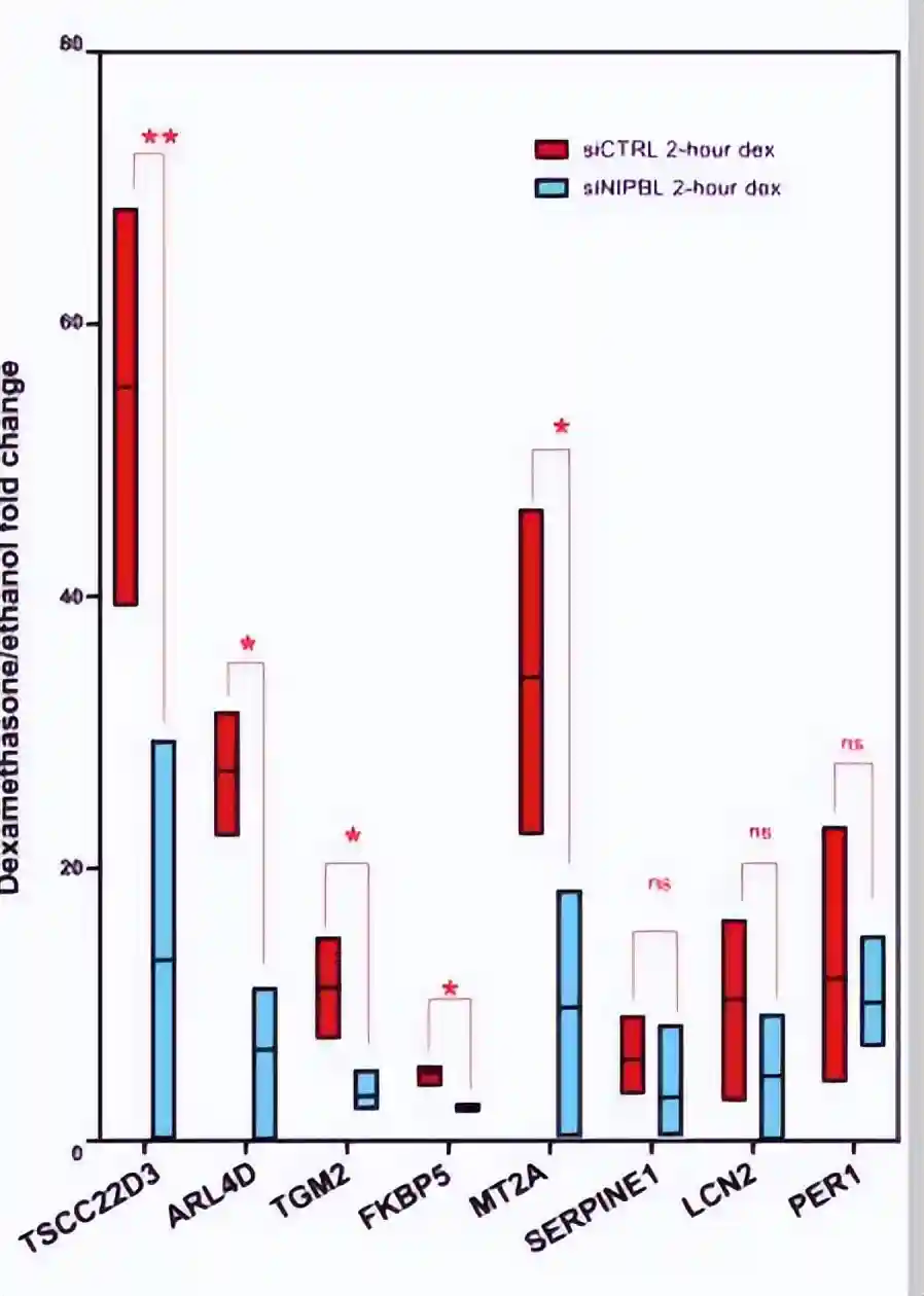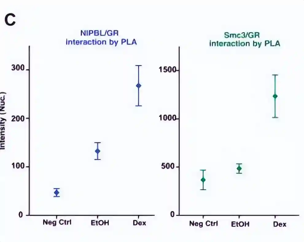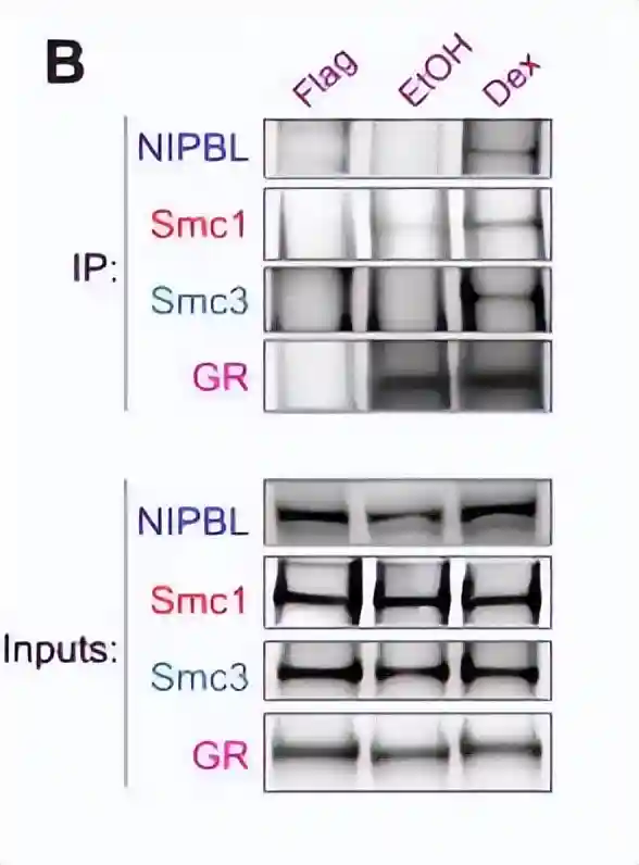 这一结果通过独立的方法,包括免疫沉淀和邻近连接测定进行了证实,显示了内源性GR、NIPBL和凝聚素复合物的存在。