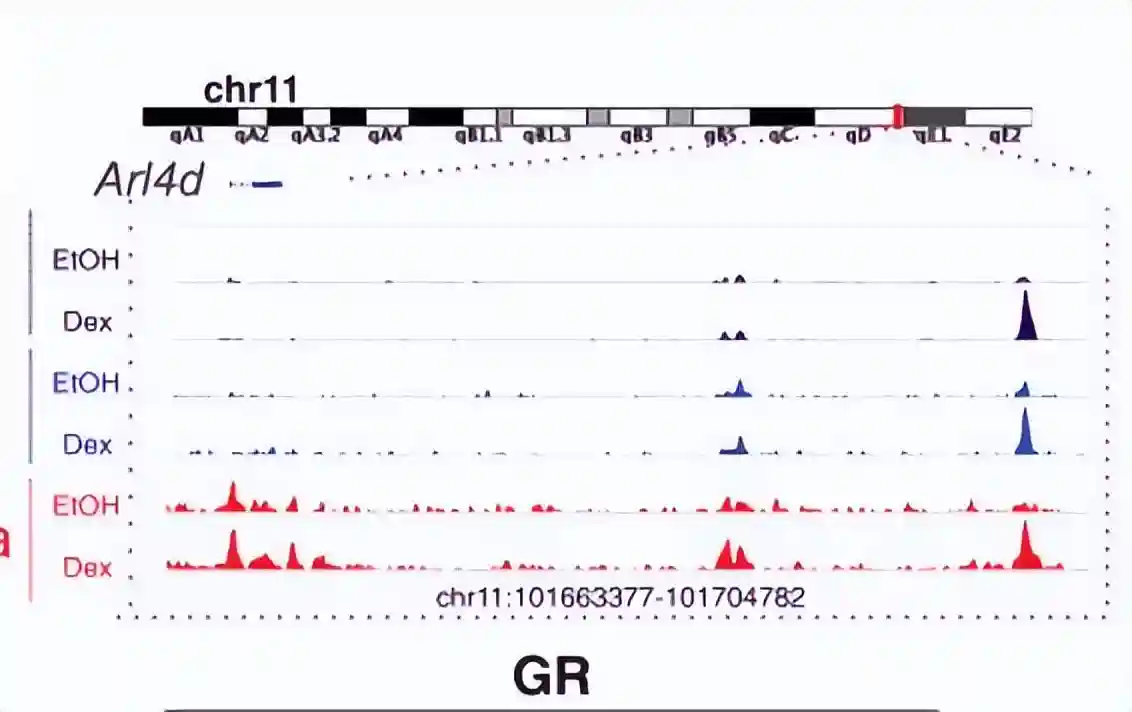 共有561条建筑条纹(分辨率为5kb)与遗传资源特异性地结合,与对照的EtOH相比,地塞米松处理显著增强了GR结合的建筑条纹,表明GR染色质结合促进更高的相互作用频率。