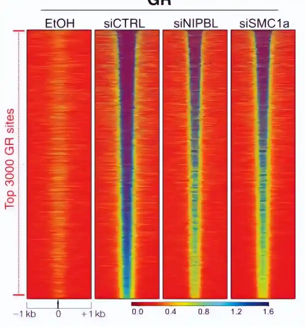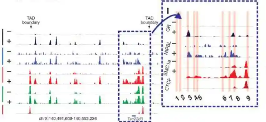 ChIP-seq分析结果表明,在处理地塞米松1小时后,GR结合的染色质元件上,NIPBL和SMC1a的结合增加。