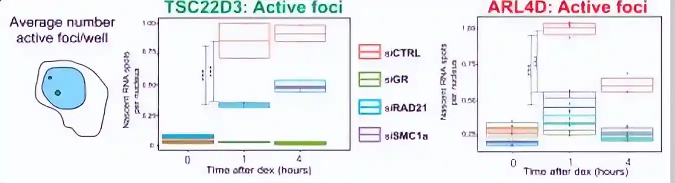 为了准确地研究凝聚素丧失对基因表达的影响,采用了高通量版本的杂交链反应(HCR)RNA荧光原位杂交(FISH)技术,来探测已知的GR靶基因Tsc22d3和Arl4d在单细胞水平上的表达变化。