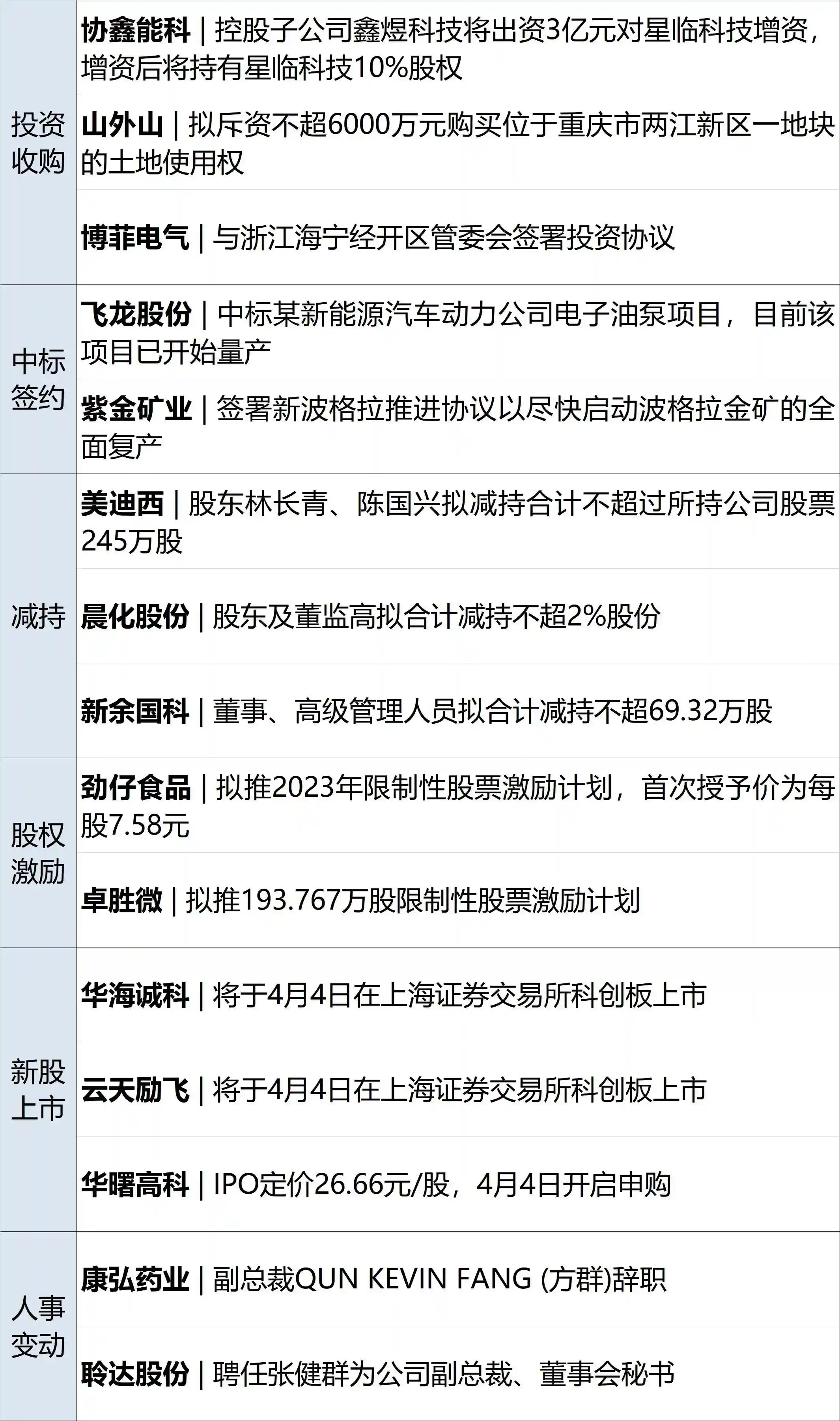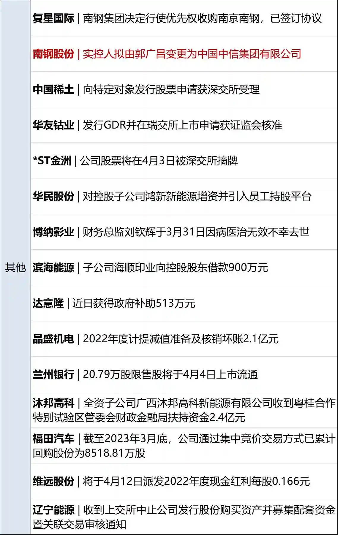 南钢股份(SH600282,股价3.89元,市值239.8亿元):4月2日公告,新冶钢拟135.8亿元增资南钢集团,将持有其55.25%股权,并成为南钢集团控股股东;同日,南钢集团决定行使优先购买权,向复星系股东购买公司控股股东南京钢联60%股权。新冶钢的上级管理单位为中信股份,交易完成后,南钢集团将持有南京钢联100%股权,并成为公司间接控股股东,公司实控人将由郭广昌变更为中国中信。