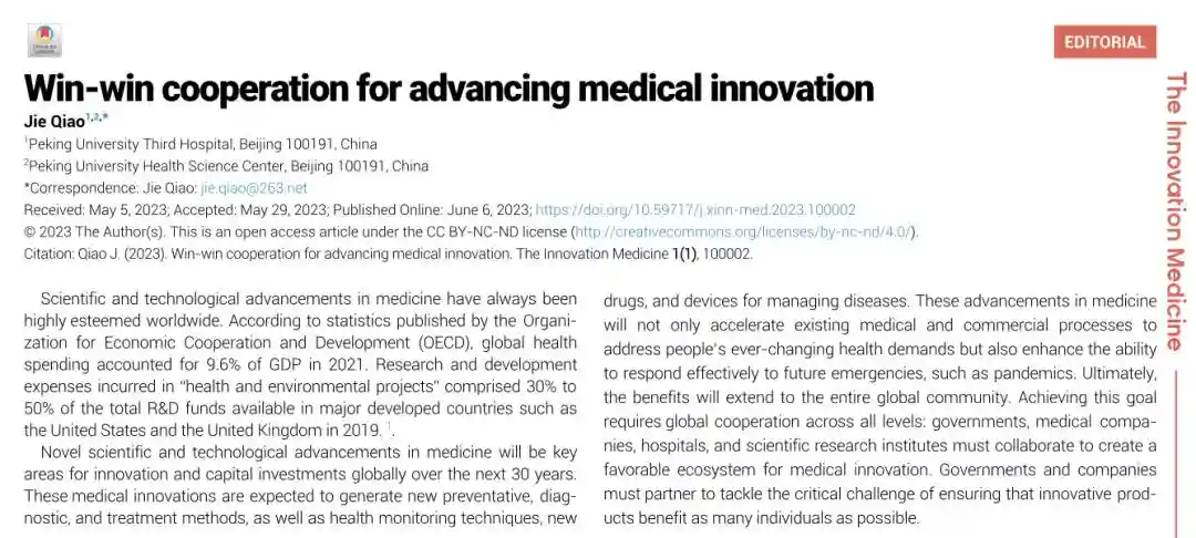 TheInnovationMedicine以守护人类健康、支撑高质量发展为宗旨,聚焦世界医学科技进步与知识创新,推动医学事业发展和学术交流,让最新的科研成果在由研究人员、临床医生、行业从业者、政策制定者、媒体机构、患者和更广泛的公众组成的全球网络中广泛传播,最终造福全人类。期刊主要刊载临床及实验研究论文、报告、评述、综述、展望、图解等类型文章,同时也向读者提供医学、公共卫生及保健领域非临床性信息,涉及政策、产业、文化、伦理、环境、科普等方面内容。