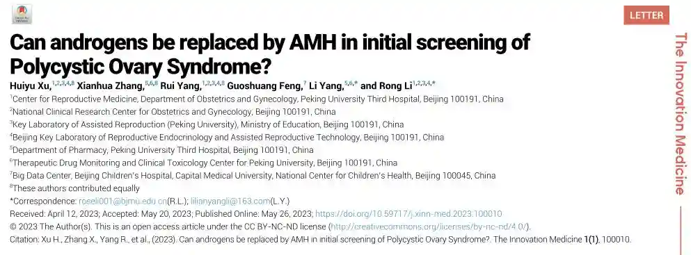 生殖医学科李蓉/药剂科杨丽研究团队发表了题为“CanandrogensbereplacedbyAMHininitialscreeningofPolycysticOvarySyndrome?”(AMH能够代替雄激素用于多囊卵巢综合征的初筛吗?)文章。
