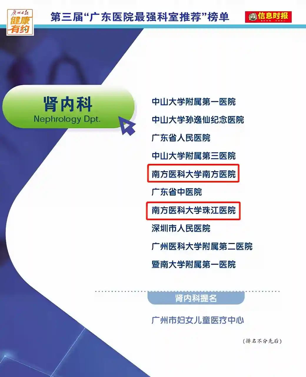 与此同时,经历了数十年的深厚积淀与积极探索,学校的肾脏病研究与临床实践也获得了社会的高度认可。2021年,南方医科大学南方医院、珠江医院肾内科悉数上榜第三届“广东医院最强科室推荐·2021”,获评广东最强科室。在同年发布的2020年度复旦版中国医院排行榜全国专科声誉排名中,南方医院肾脏病专科位居全国医院第4名。