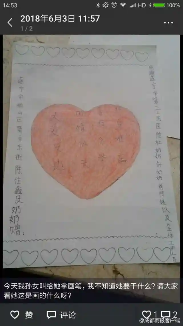 “她喜欢看书写作文,我看她病得那么重,不想她动脑筋,就没让她看。”蒋全芳说,所以,佳鑫就开始画画,画的爱心都送给了照顾自己的医护人员,还有来病房看自己的好心人。“她说她在中国有56位父母,我问为啥,她说因为中国有56个民族,做手术的几十万捐款肯定都是各个民族的人捐的。”蒋全芳说。