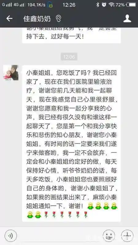 佳鑫奶奶蒋全芳告诉成都商报客户端记者,大概因为生病太久,小小的佳鑫知道自己这次病得太重。离世前三天,佳鑫请奶奶答应自己,要在朋友圈里,感谢那些曾经帮过自己的好心人,祝愿天下所有人永远健康,没有病痛,没有烦恼,万事顺心如意,一切平安顺利。