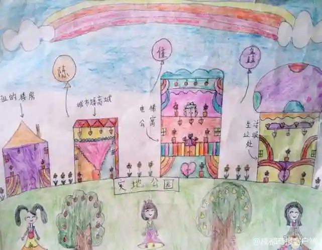 佳鑫画的画,叫做《我的家园》,这是一片公园绿地,画上,草木成荫,繁花盛开。画上有4栋房子,一栋是祖祖的楼房,一栋是城市矮高城(层),一栋电梯公寓,一栋是生活垃圾处理处。在创意说明上,佳鑫写道: