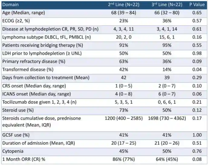 二线治疗组和三线治疗组的年龄(P=0.65)、ECOG≥2的患者比例(P=0.57)、清淋前患者疾病的状态(P=0.61)、LBCL亚型(P=0.16)、接受桥接治疗的患者比例(P=0.55)、清淋前LDH水平升高的患者比例(P=0.98)以及两组间从单采到治疗的天数(P=0.29)均无显著差异。