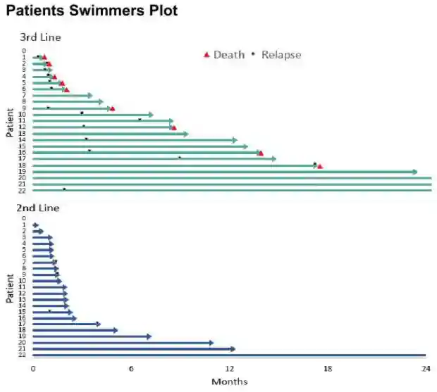 二线治疗组的中位随访时间为2.2(范围:1-28.8)个月,三线治疗组的中位随访时间为10.8(范围:1-39)个月。