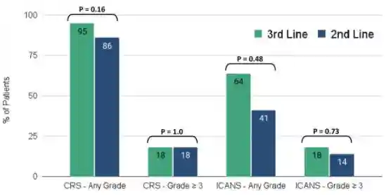 二线治疗组和三线治疗组免疫效应细胞相关神经毒性综合征(ICANS)总体发生率(41%vs64%;P=0.48)和3-4级ICANS发生率相当(14%vs18%,P=0.73)(图3)。与三线治疗组相比,二线治疗组ICANS发病的中位天数有较短趋势([6,范围:0-7]vs[4,范围:0-8];P=0.06)(表1)。