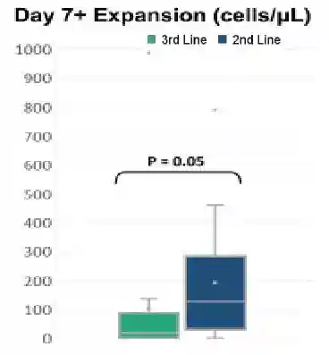 与三线治疗组相比,二线治疗组Day7+CAR-T中位扩增水平显著较高(P=0.05)(图4)。