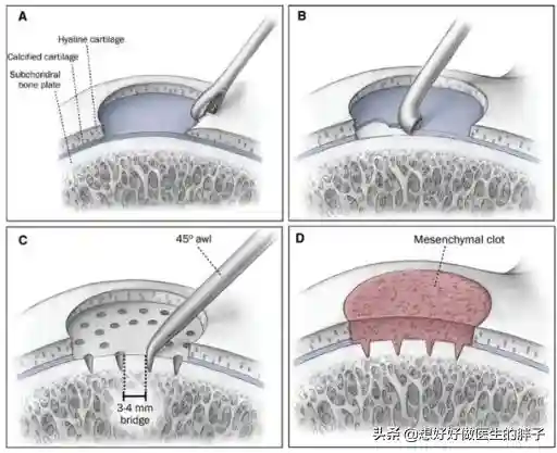 大家看下图,可能对这种技术会有更深的理解,相当于我们人为的将骨髓腔内的有促进损伤修复作用的血液引出来。来作为更好的粘合剂,帮助我们修复损伤的软骨面。