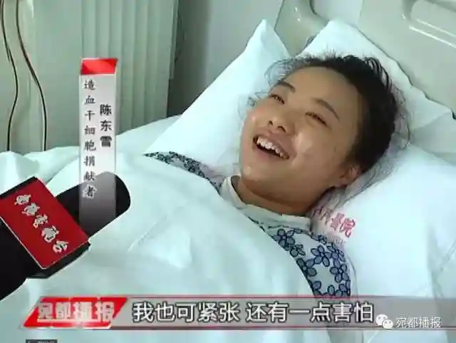 造血干细胞捐献者陈东雪:第一次躺在这儿我也可紧张可害怕但是通过大家的鼓励护士的鼓励感觉也没有啥紧张的了很平静并且现在希望把自己的造血干细胞赶快送给另外一个病人让他早日康复。