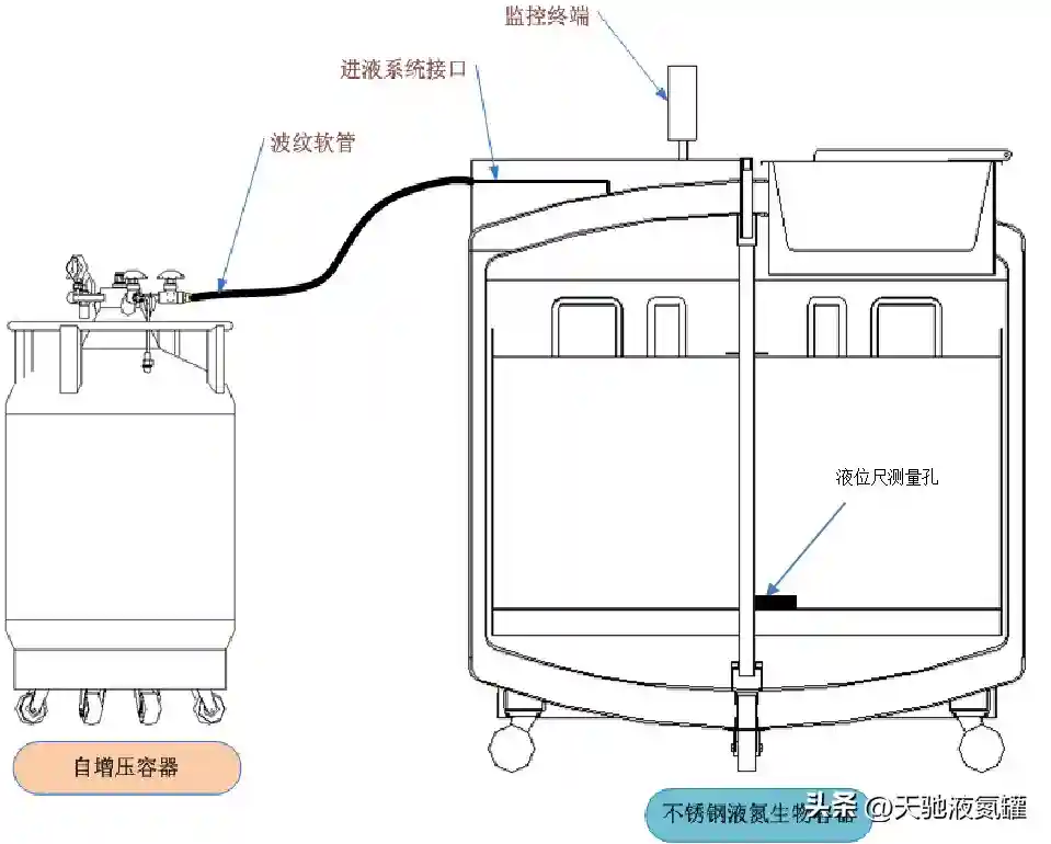 将自增压液氮罐和干细胞液氮存储罐的进液管道连接在一起,设定好“补液高度”和“停止补液高度”。
