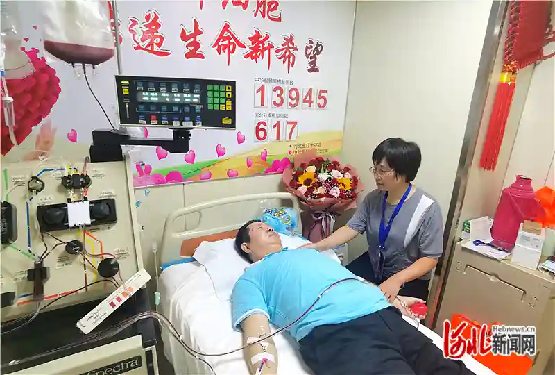 今年53岁的王向东来自河北邯郸大名县,是金滩镇中心卫生院的一名医生。今天上午,在河北医科大学第二医院,经过5小时的采集,他成功捐献260毫升造血干细胞混悬液,成为河北省年龄最大的造血干细胞捐献者。