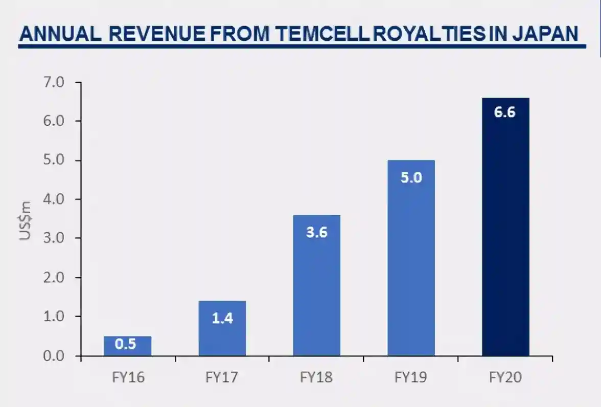 在JCR的财报中,Temcell的销售收入在2018年约1800万美元,2019年约2800万美元。