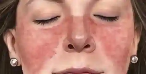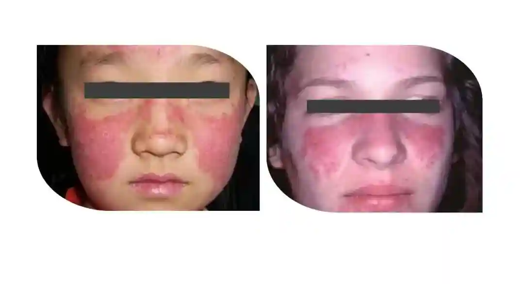 盘状红斑狼疮(DLE):呈持久性盘状红色斑片;多发群体为生育期女性