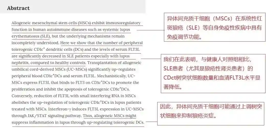 文章的”摘要“提到:异体间充质干细胞在系统性红斑狼疮等自身免疫性疾病中具有免疫调节功能。