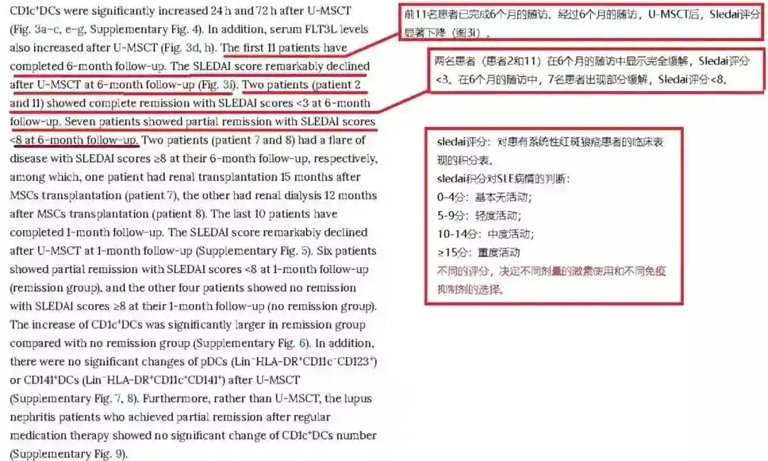 11名红斑狼疮患者在经过间充质干细胞移植治疗后,在6个月的随访中,sledai评分显著下降;其中两名患者的病症得到完全缓解(sledai评分<3),7名患者部分缓解(sledai评分<8)。