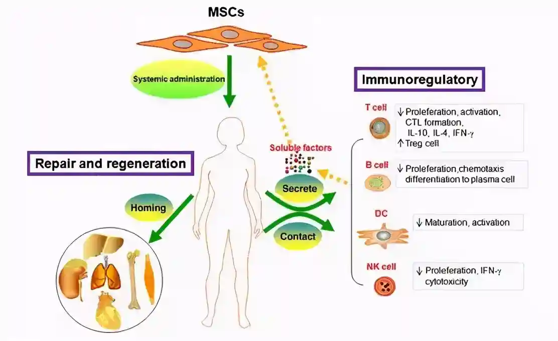 2.调控巨噬细胞、T细胞等功能,促进T细胞向调节性T细胞转化,诱导免疫耐受。——《间充质干细胞对系统性红斑狼疮T淋巴细胞的免疫调节作用》