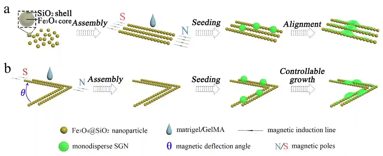 该研究论文题为“Controllablegrowthofspiralganglionneuronsbymagneticcolloidalnanochains”。在此项研究中,研究人员通过磁场诱导磁性纳米颗粒自组装形成多方向磁性纳米线材料,实现了螺旋神经元细胞在体外二维环境中的多方向定向调控生长,并通过RNA-seq技术在转录水平揭示了磁性纳米线材料调控螺旋神经元细胞定向生长的作用机制。