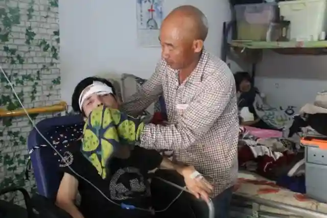 他的妻子女儿均患后脑萎缩家族遗传病,因病致残,生活不能自理。