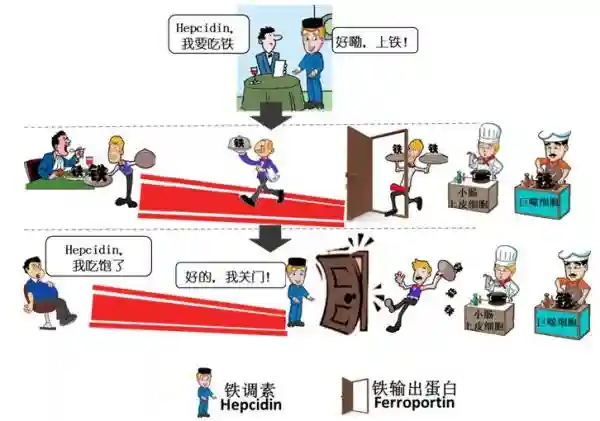 当身体提示缺铁时,这只“手”不会关闭“阀门”,从而使得铁源源不断的从脾脏中释放到血液并运送到骨髓等需铁部位,同时十二指肠吸收的铁也会在一定程度上增加;而当身体提示铁过多时,“手”会立刻关掉“阀门”,从而有效减少铁从脾脏中排出和十二指肠对铁的吸收。