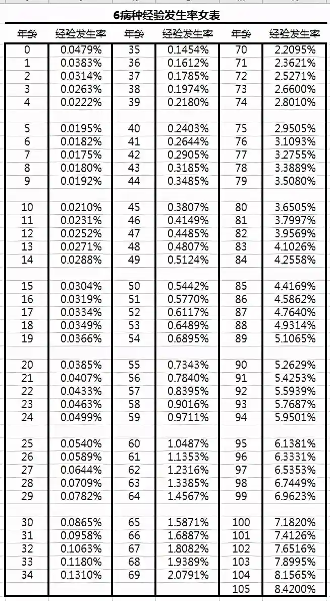 查阅中国人身保险业重大疾病经验发生率表可知:不管是男性还是女性,年龄越大,疾病发生率越高
