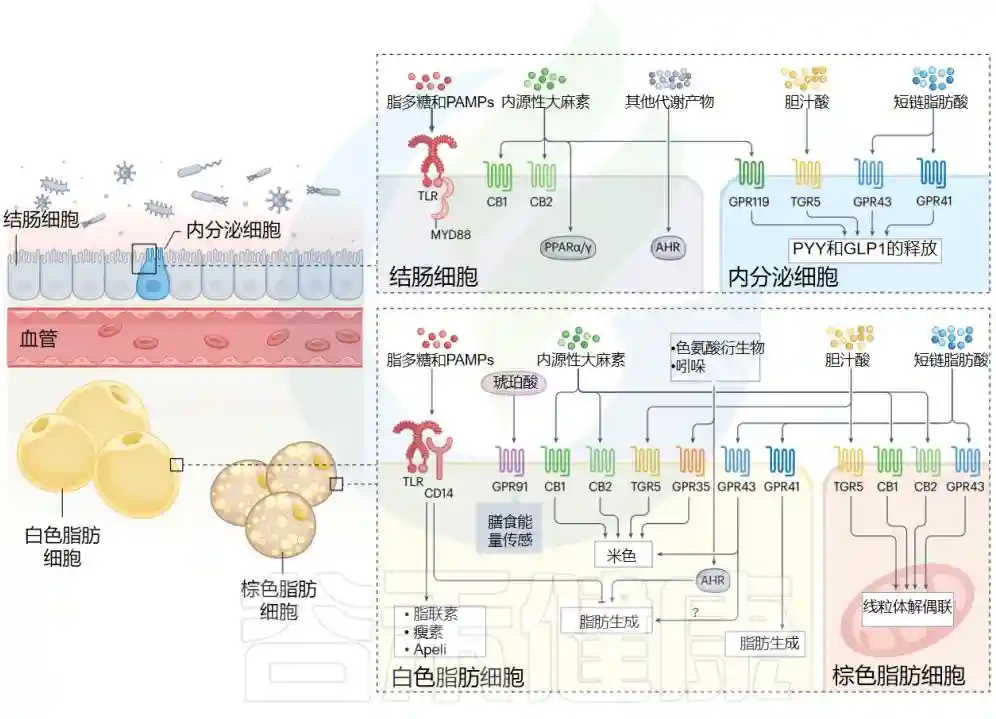 开创性研究表明,缺乏肠道微生物(即无菌小鼠)或肠道微生物群耗尽(即使用抗生素)的小鼠产生的脂肪组织较少,许多研究调查了肠道细菌之间存在的复杂相互作用,其中一些它们的膜成分(即脂多糖)及其代谢物(即短链脂肪酸、内源性大麻素、胆汁酸、芳基烃受体配体和色氨酸衍生物)以及它们对WAT褐变和/或米色脂肪的贡献以及BAT活动的变化。