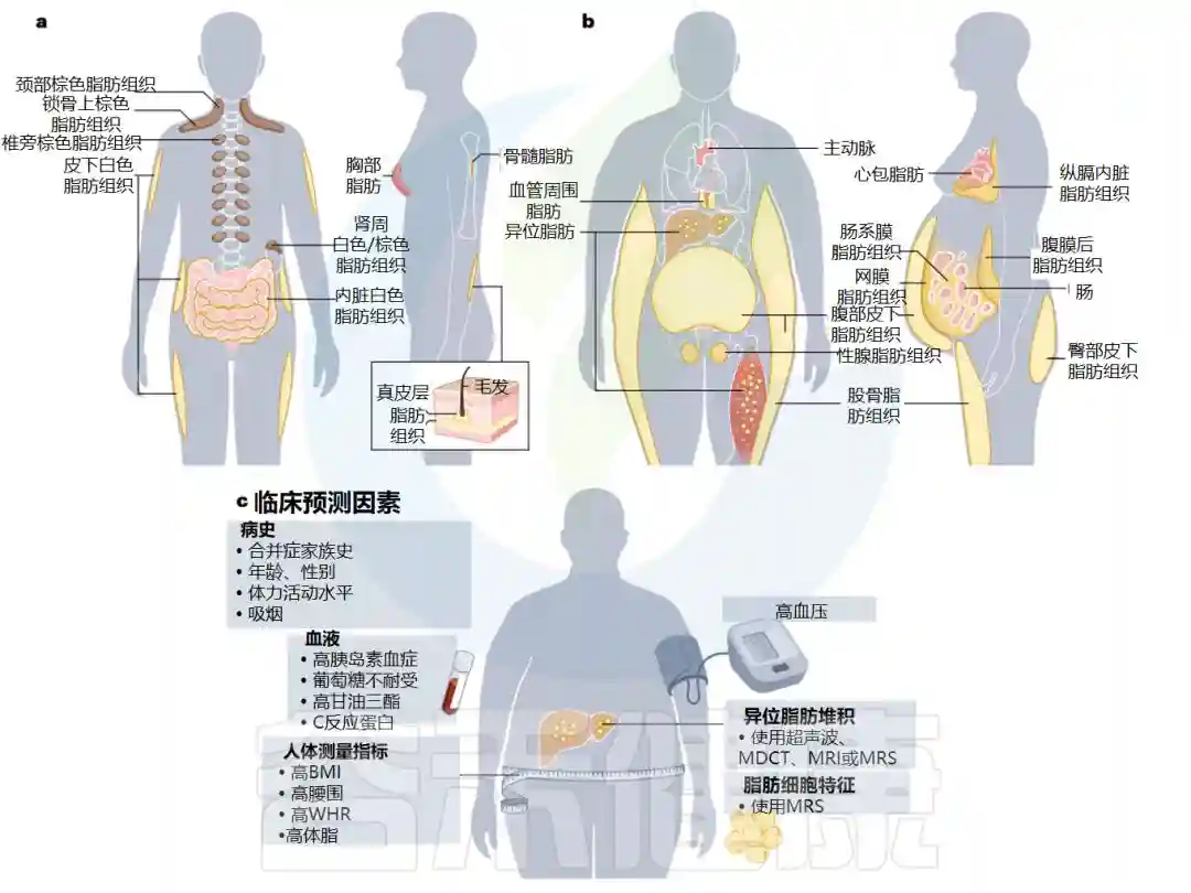 临床上可以根据病史、血液检查和人体测量指标以及异位脂肪堆积和不良脂肪细胞特征的成像来预测与肥胖相关的病理。