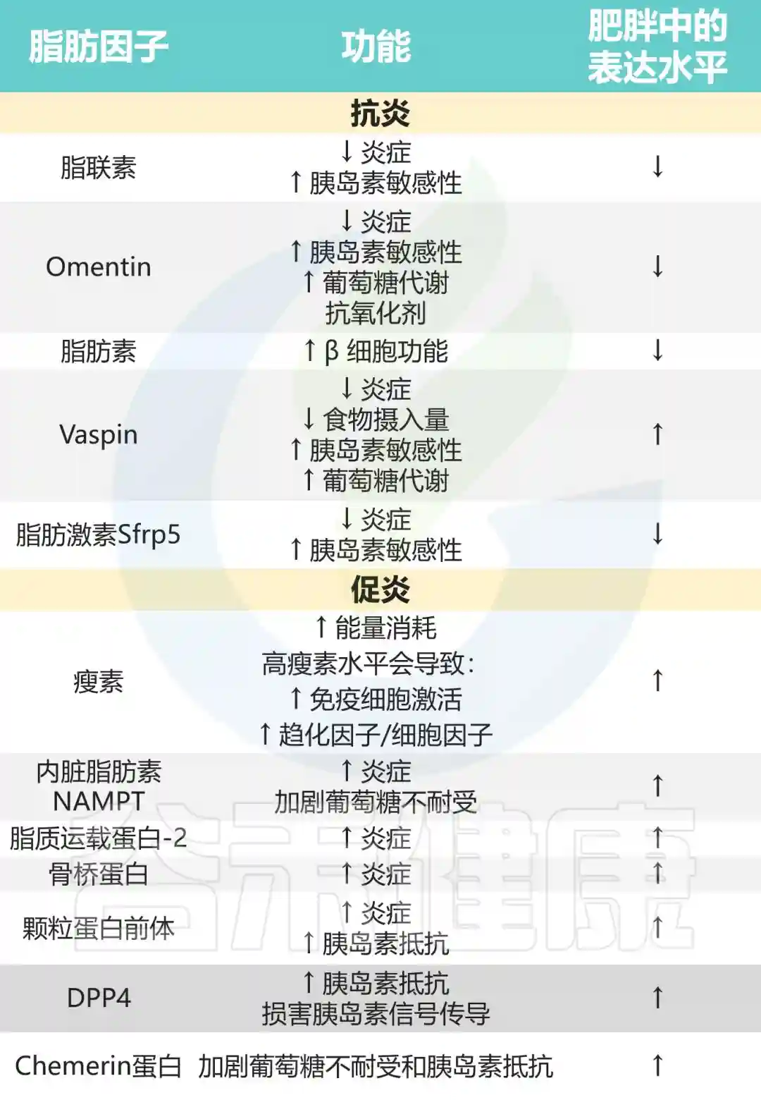 脂肪细胞表达的脂肪因子的选择、它们的关键生物学作用以及表达水平随肥胖的变化如表所示。为了更深入地回顾脂肪因子(包括非脂肪细胞表达的脂肪因子)及其在健康和病理学中的作用。