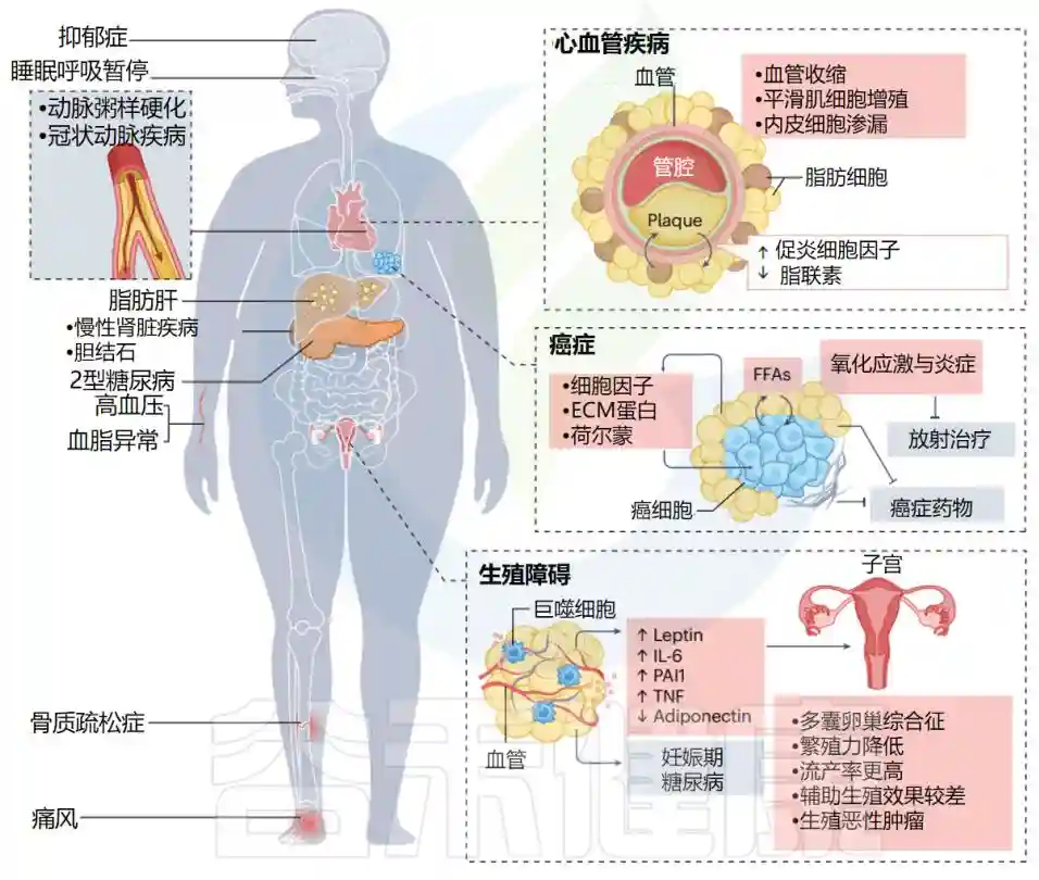 肥胖和脂肪细胞功能障碍对心血管疾病、癌症和生殖的影响。