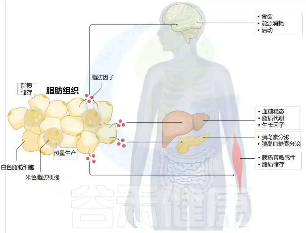 除了储存脂质(白色和米色脂肪组织)和产生热量(米色和棕色脂肪组织)外,人体脂肪组织还通过产生脂肪因子参与各种代谢功能。