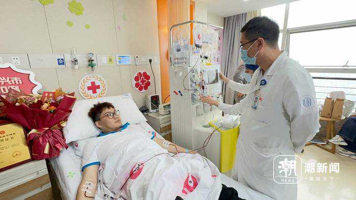 唐超(左一)正在进行造血干细胞采集。(记者郁馨怡摄)