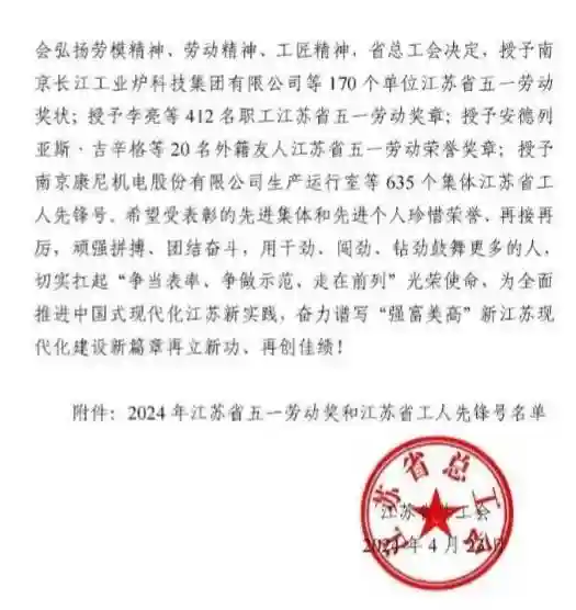 2024年是党和国家历史上具有里程碑意义的一年,也是江苏高质量发展砥砺奋进的一年。为表彰先进、树立榜样,在全社会弘扬劳模精神、劳动精神、工匠精神,省总工会决定,授予南京长江工业炉科技集团有限公司等170个单位江苏省五一劳动奖状;授予李亮等412名职工江苏省五一劳动奖章;授予安德列亚斯·吉辛格等20名外籍友人江苏省五一劳动荣誉奖章;授予南京康尼机电股份有限公司生产运行室等635个集体江苏省工人先锋号。