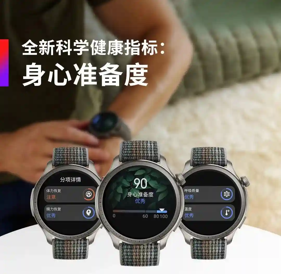 它是Amazfit史上第一款支持全新健康指标:身心准备度的产品。身心准备度基于静息心率、心率变异性、呼吸质量和皮肤温度等专业健康数据得出,可以帮助你快速掌握当日体力与精神压力状态,从而更合理科学地规划每日工作、锻炼、休息安排。