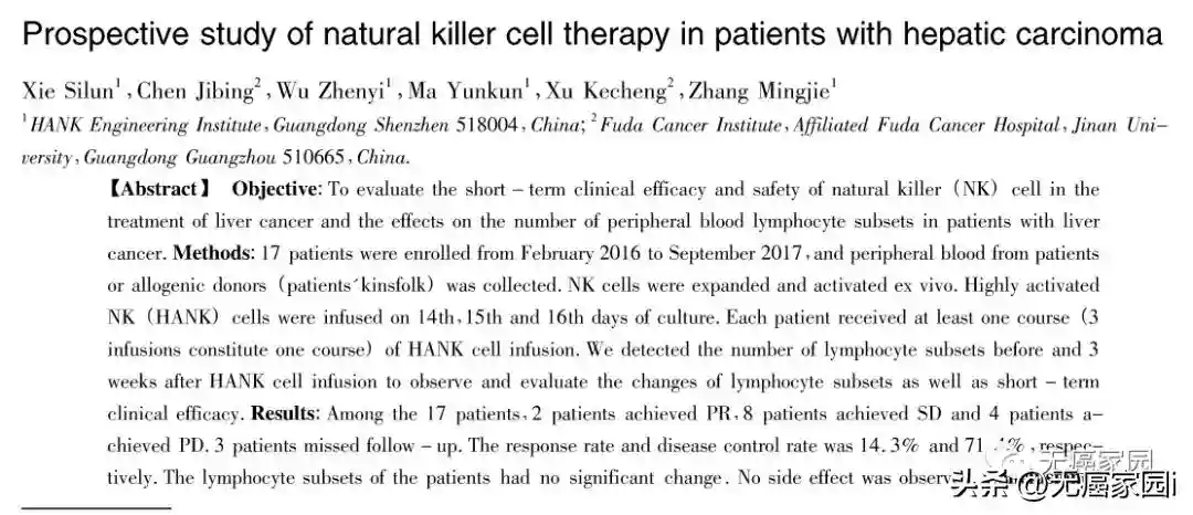 最近一篇发表在《JournalofModernOncology(现代肿瘤医学)》杂志上关于自然杀伤细胞治疗肝癌的前瞻性研究中,来自暨南大学附属复大肿瘤医院肿瘤研究所的医学者们对2016年2月~2017年9月收治的17例肝癌患者进行了NK细胞免疫治疗,向患者体内注射了在体外增殖的高活性NK细胞,并对患者病情进行了追踪观察和检测。