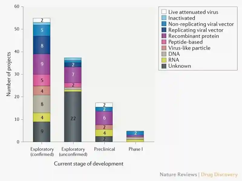 图1.采用不同技术的候选新冠疫苗。(Exploratory:还在早期研发的项目(分为已确认(confirmed)和未确认(unconfirmed)),没有进行动物模型测试;Preclinical:临床前项目,处于动物模型测试和/或生产临床试验用料的阶段。)