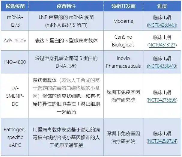 最近,最先进的候选疫苗已进入临床试验阶段,包括Moderna的mRNA-1273,CanSinoBiologicals(康希诺生物)的Ad5-nCoV,Inovio的INO-4800、LV-SMENP-DC和深圳市免疫基因治疗研究院的病原体特异性aAPC(表1)。其他许多疫苗开发商也表示计划在2020年开展人体试验。