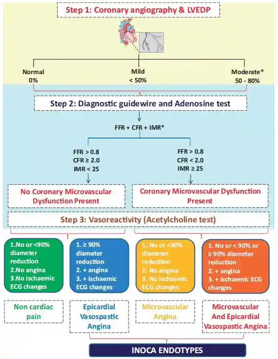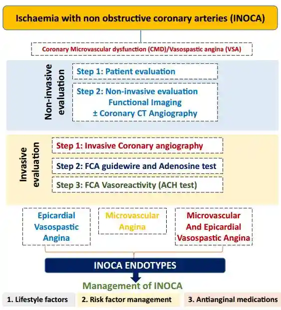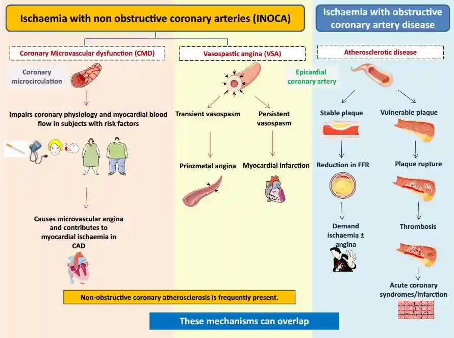 阻塞性冠脉疾病(CAD)是心肌缺血的常见原因,但许多被评估为严重狭窄的病变并不存在血流限制。在非阻塞性CAD情况下,血管功能障碍也可能导致心脏缺血,被称为INOCA。INOCA十分常见,微血管功能障碍(CMD)和/或心外膜冠状动脉痉挛是INOCA两大发病机制。(图1)。