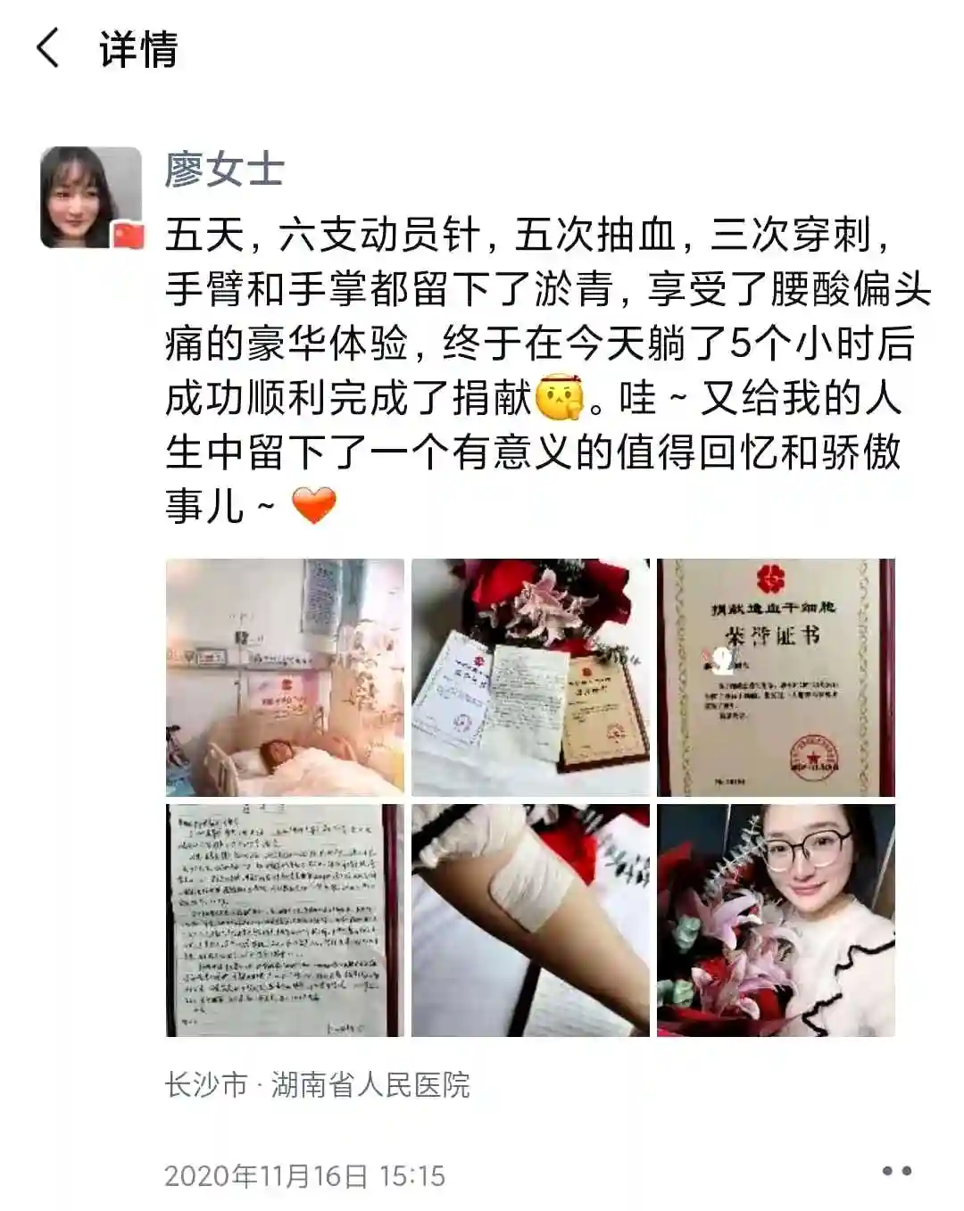 在征求家人同意后,她决定为这位素昧平生的白血病患者捐献干细胞。廖婉伶在朋友圈里写下一段话:五天,六支动员针,五次抽血,三次穿刺,手臂和手掌留下了淤青,但是给人生留下了骄傲的事儿!