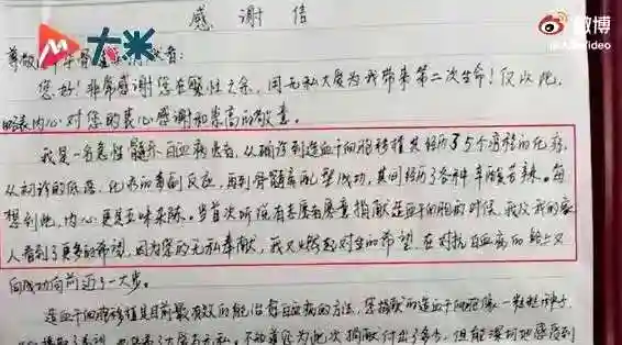 受捐患者也写了一封信向未曾谋面的捐赠者表达感谢:“当听说有志愿者愿意捐献造血干细胞的时候,我又燃起对生的希望……”
