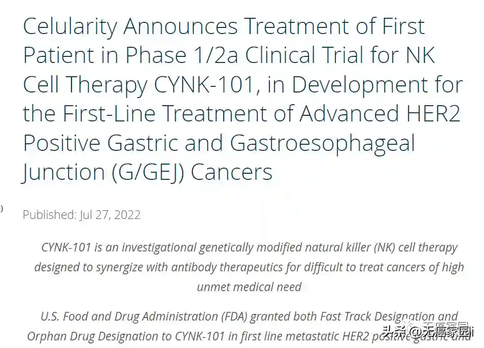 2022年7月27日,Celularity生物技术公司宣布,其研发的NK细胞疗法CYNK-101的1/2a期临床试验已经完成了首例患者给药,该试验针对晚期HER2阳性胃或胃食管交界处(G/GEJ)癌症的一线治疗。