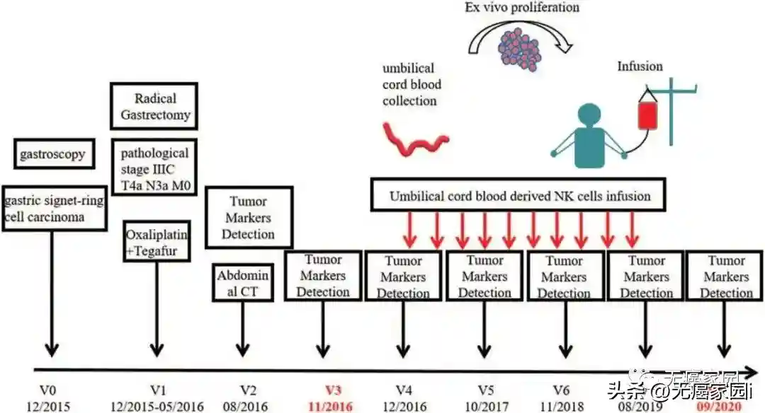 该案例报道的是一名41岁患有胃混合印戒细胞癌患者,他于2015年12月~2016年5月在根治性胃切除术后接受奥沙利铂+替加氟联合化疗6个周期(V1)。治疗后CA72-4水平显著下降(V2)。3个月后(V3),CA72-4水平迅速上升至86.34U/mL。2016年11月(V4),患者开始接受每年3次的NK细胞治疗。NK细胞治疗后(V4-V8)肿瘤标志物检测和腹部CT扫描显示,它正在变得正常且状况良好。