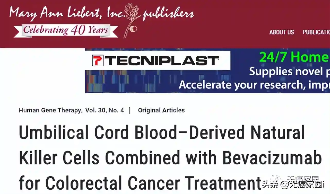 我国的研究团队发表在《HumanGeneTherapy》杂志上的一篇论文中,研究者成功地将脐带血(UCB)中的NK细胞通过膜结合白细胞介素(IL)-21进行扩增,命名为eUCB-NK细胞。在动物试验中,证明了脐带血NK细胞具有较强的体内抗肿瘤活性,适用于晚期结直肠癌患者。联合贝伐单抗可以增加NK细胞浸润,发挥更好的治疗效果。
