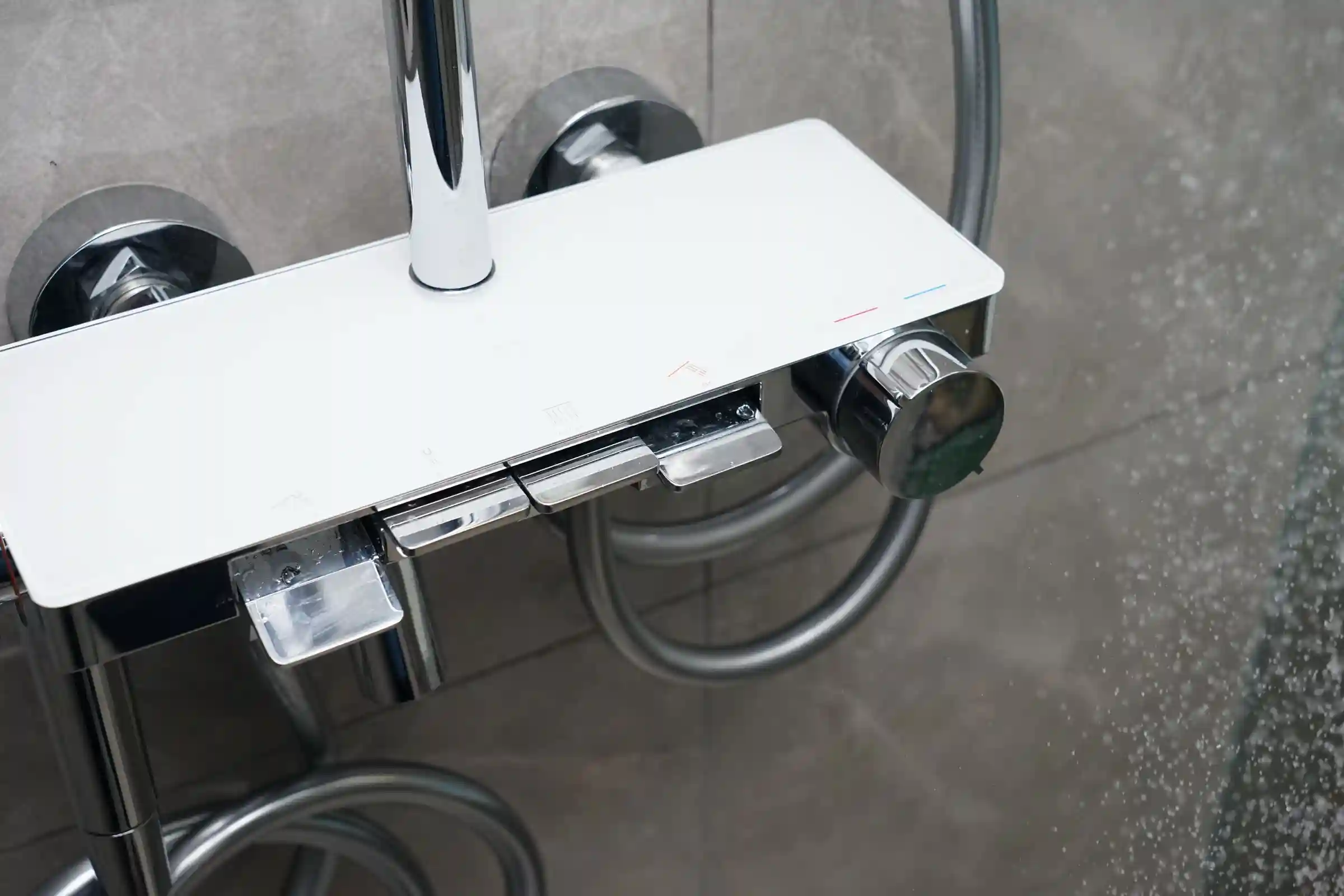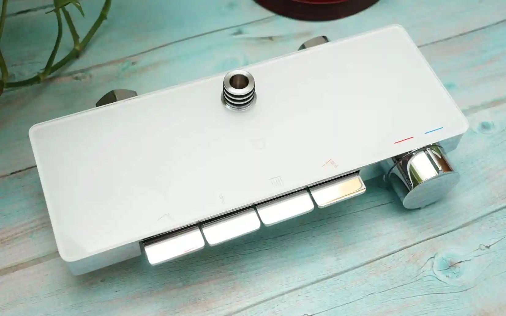 沉甸甸的淋浴主体控制台,一共4个钢琴按键以及温控旋钮。控制台最上面是一层珠光白钢化玻璃,可以充当置物平台来使用。控制台经19道工序精密雕琢,11重高精度丝网印刷,表面莹白如玉,边角顺滑,方便沐浴露、洗发水等洗浴用品日常收纳,也更耐腐蚀,更易清洁。